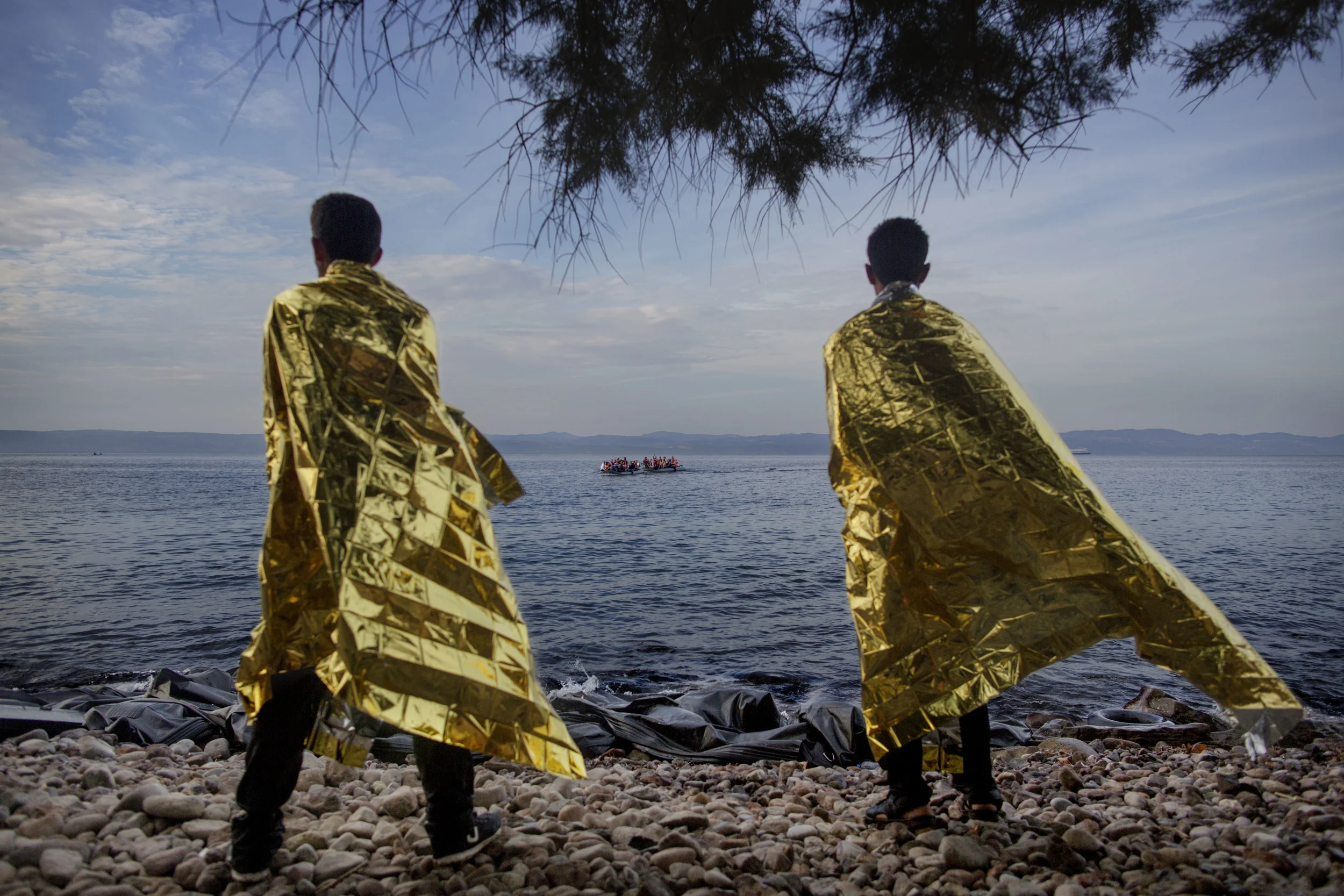 To menn forsøker å få tilbake varmen med varmefolier delt ut av frivillige. De ankom den greske ferieøya Lesbos noen minutter tidligere. Nå ser de to nye gummibåter med flyktninger ankomme øya.